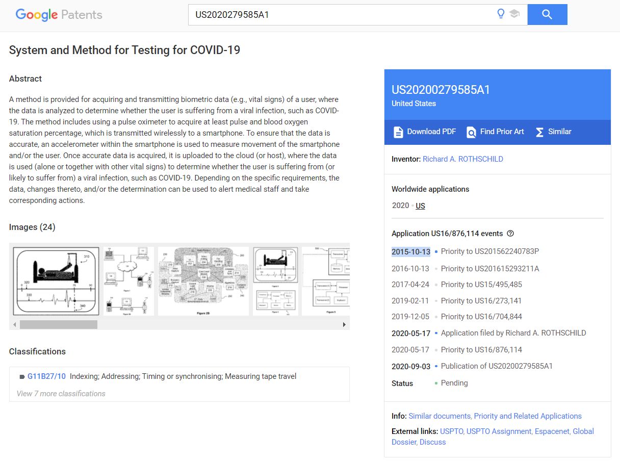 In 2015 a ‘System and Method for Testing for COVID-19’ was patented by Richard Rothschild, with a Dutch government organisation. Did you catch that? In 2015 – four years before the disease even existed – a testing method for COVID-19 was developed. (2B)